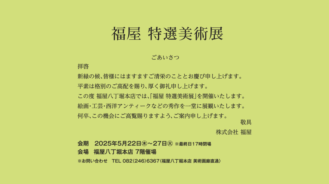 2025年5月21日 広島 福屋「特選美術展」 2025年5月22日~2025年5月27日広島の百貨店 福屋にて注目の作家として 轟友 宏 がピックアップ。 福屋八丁堀本店〒730-8548 広島県広島市中区胡町6−26Tel.082-246-6111 NEWS